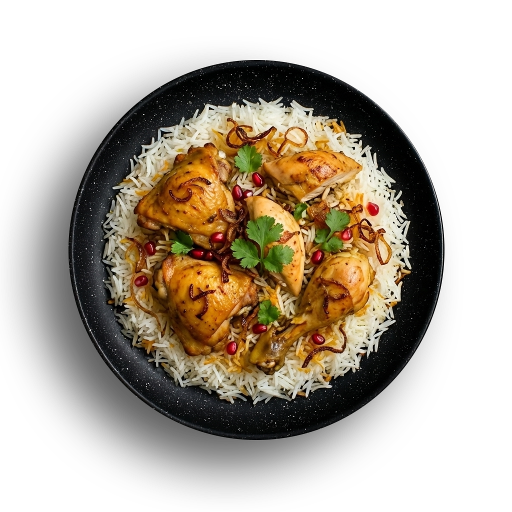 Kasia Biryani Rice is a delightful blend of tender chicken, fragrant basmati rice, and warming spices. The dish is enhanced with creamy yogurt, fresh tomatoes, and a hint of saffron mixed with Kadi water, giving it a unique and delicate flavour. Finished with roasted cashews and parsley, this biryani is both comforting and celebratory, perfect for any special occasion