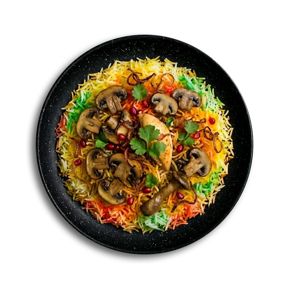 Mushroom Biryani Is A Rich And Hearty Vegetarian Delight. Tender Mushrooms Cooked With Aromatic Spices And Premium Basmati Rice, Finished To Perfection On Dum.